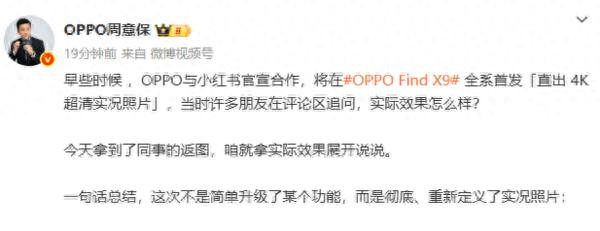据OPPO Find系列产品负责人周意保最新发布的信息显示,与此前曝光的消息基本一致,全新的OPPO Find X9全系将首发“直出4K超清实况照片”功能,将彻底、重新定义实况照片。他表示,4K超清实况照片比传统实况Live提升了整整400%!只需在哈苏超清模式中按下快门,用户就将同时获得一张超高像素的封面,和一整段3秒的4K超清视频。此外,OPPO还联合小红书打通了平台的分享链路,让拍摄的4K超清实况照片,不仅可以在相册珍藏,还可同步在小红书超清显示播放。