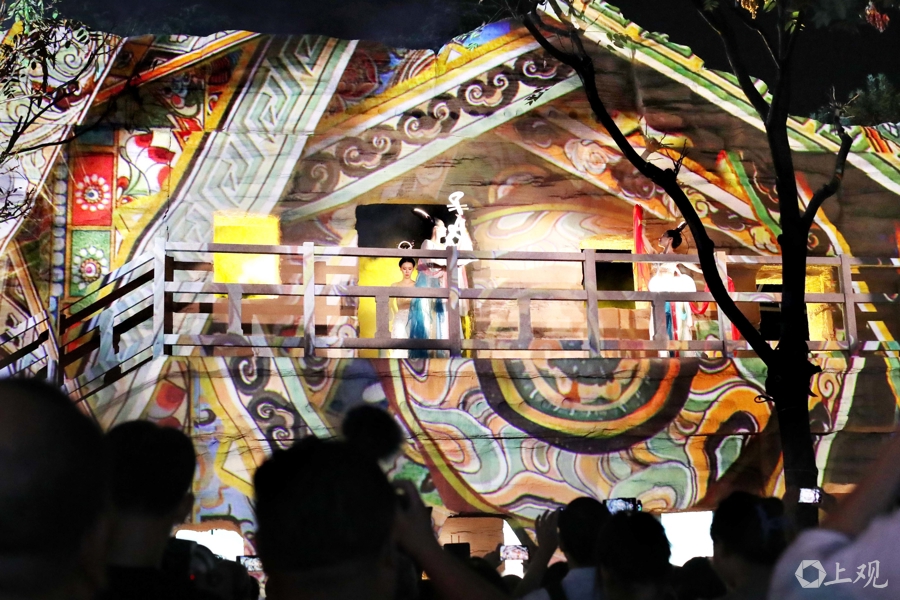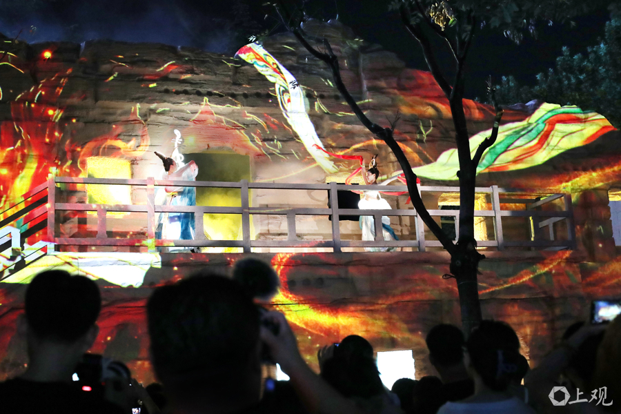 静安公园门口,《洞见220》沉浸式敦煌光影文化街区,通过3D Mapping、激光与投影技术,在建筑立面上展开一幅流动的敦煌艺术长卷,让大漠意象融于城市夜景之中。